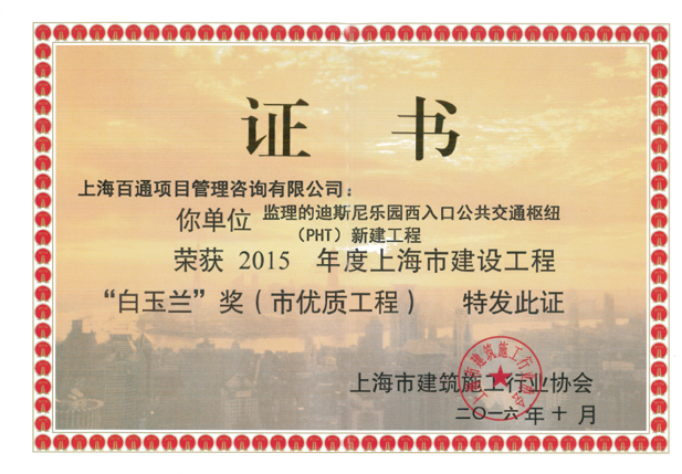 我司監(jiān)理的迪士尼樂園西入口公共交通樞紐(PHT)新建工程榮獲2015年度上海市建設(shè)工程“白玉蘭”獎(市優(yōu)質(zhì)工程)。