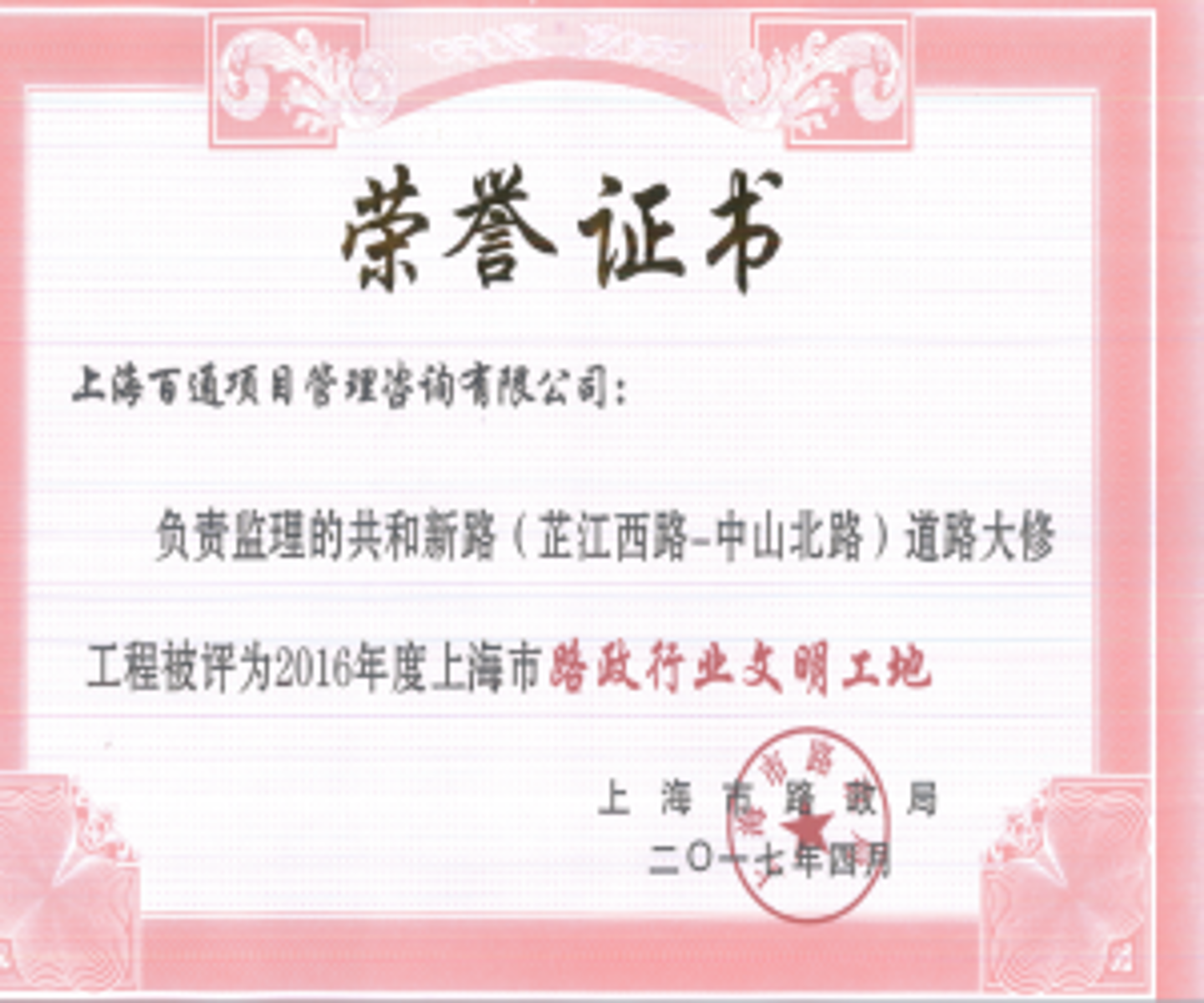 共和新路大修工程(本標(biāo)段)于2016年10月開工建設(shè),在工程施工準(zhǔn)備階段,主管單位靜安區(qū)市政工程和配套管理中心提出,以建設(shè)“市文明工地”為目標(biāo),高效、安全、高質(zhì)量地完成共和新路大修工程。我司積極響應(yīng),派駐總監(jiān)及各專業(yè)監(jiān)理工程師組成一支強(qiáng)有力、工作高效的項(xiàng)目監(jiān)理組,負(fù)責(zé)現(xiàn)場(chǎng)監(jiān)理工作。項(xiàng)目監(jiān)理組以“5+2”、“白+黑”24小時(shí)不間斷的服務(wù)理念,為工程的順利實(shí)施提供服務(wù)。工程建設(shè)期間,市路政局、靜安市政工程和配套管理中心及各主管部門多次到現(xiàn)場(chǎng)指導(dǎo)工作,在各參建單位共同努力下,工程于2017年3月份通過驗(yàn)收,并被評(píng)為2016年度上海市“路政行業(yè)文明工地”。