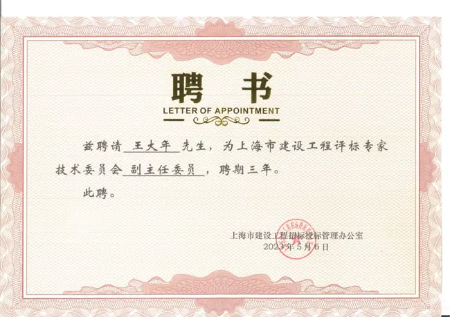 2023年5月6日下午,上海市建筑建材業市場管理總站舉行了上海市建筑工程評標專家技術委員會委員聘任會暨第一次會議,總站馬燕站長宣讀了上海市建設工程評標專家技術委員會成員名單,由同濟大學呂西林院士領銜以及36名成員組成。我司王大年董事長受聘為副主任委員兼經濟分會委員,并作了交流發言。市住建委裴曉副主任參加會議并作了重要講話。