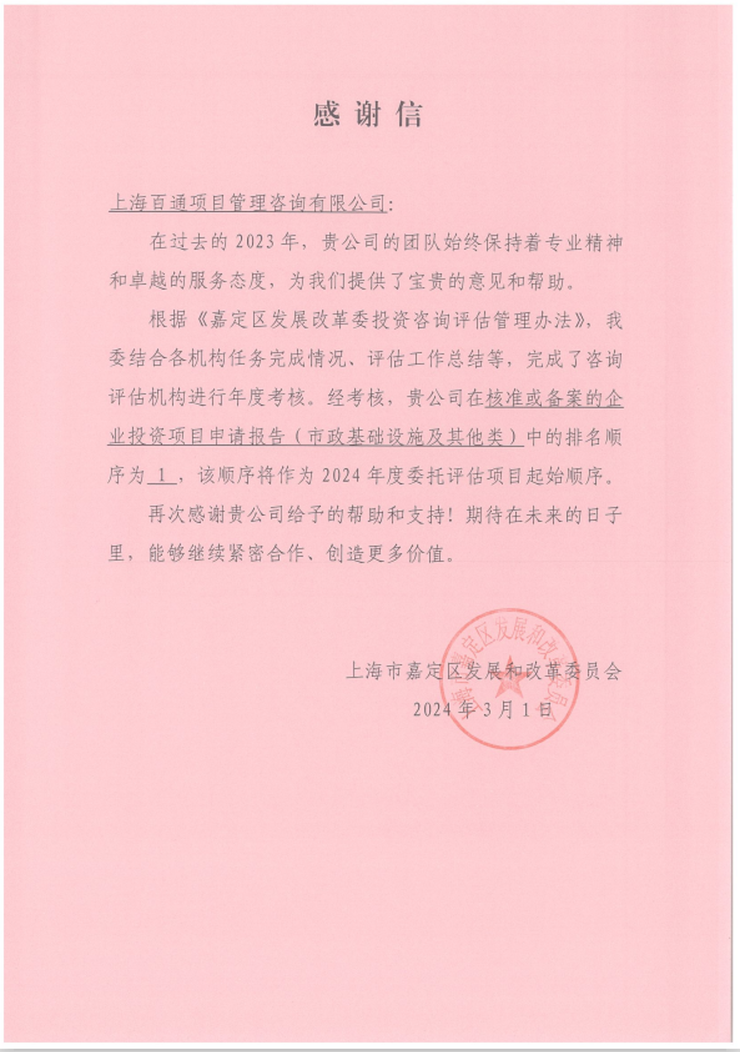 感謝信中,嘉定發(fā)改委高度評價(jià)我司團(tuán)隊(duì)的專業(yè)精神和服務(wù)態(tài)度,出色完成了各項(xiàng)委托評審業(yè)務(wù),為其投資決策提供了寶貴的意見和幫助;并表示期待今后繼續(xù)合作,創(chuàng)造更多價(jià)值。