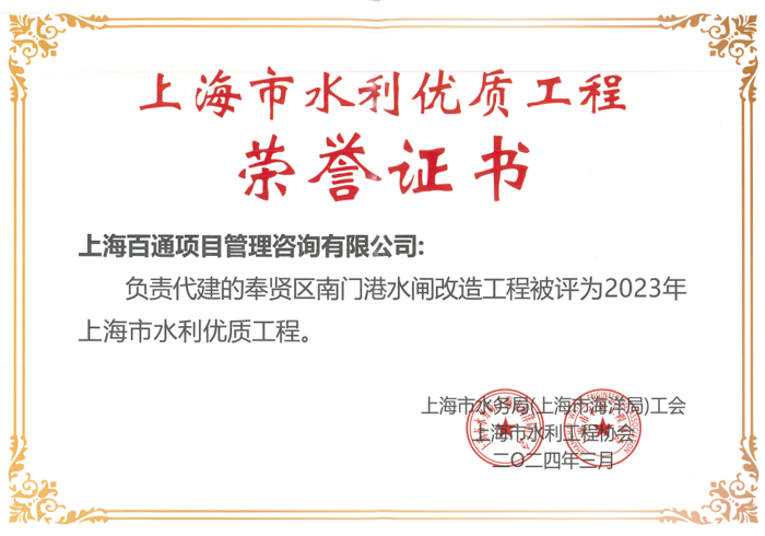 近日,我司收到上海市水務(wù)局(上海市海洋局)工會及上海市水利工程協(xié)會頒發(fā)的上海市水利優(yōu)質(zhì)工程榮譽證書,表彰我司代建的奉賢區(qū)南門港水閘改造工程被評為“2023年上海市水利優(yōu)質(zhì)工程”。