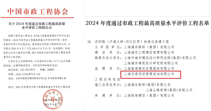 中國市政工程協會發布了2024年度市政工程最高質量水平評價工程,我司監理的濟陽路快速化改建工程項目赫然在列。濟陽路(盧浦大橋至閔行區界)快速化改建工程因地制宜,融合了既有橋梁拼寬、頂升改造、拆除重建及新建等多種結構形式,堪稱橋梁工程的“博物館”。項目全面采用BIM技術,采用多項新技術克服建造難題。