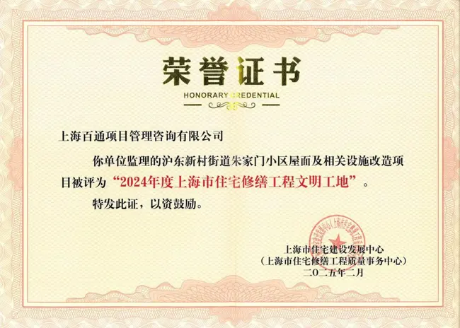 ??2025年3月13日,2024年度上海市住宅修繕工程評優結果揭曉,由我司監理的滬東新村街道朱家門小區屋面及相關設施改造項目,在全市300余個住宅修繕項目中脫穎而出,榮膺“2024年度上海市住宅修繕工程文明工地”稱號!該項目是2024年度浦東新區唯一獲獎的修繕類項目,彰顯了百通監理在城市更新住宅修繕領域的技術實力與社會責任擔當。